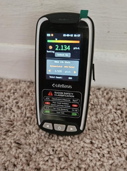LifeBasis home radon detector features color display, long & short-term tracking, visual/audible alarms, and rechargeable battery. Accurately detects radon levels (pCi/L or Bq/m³) to protect your family from lung cancer risks.