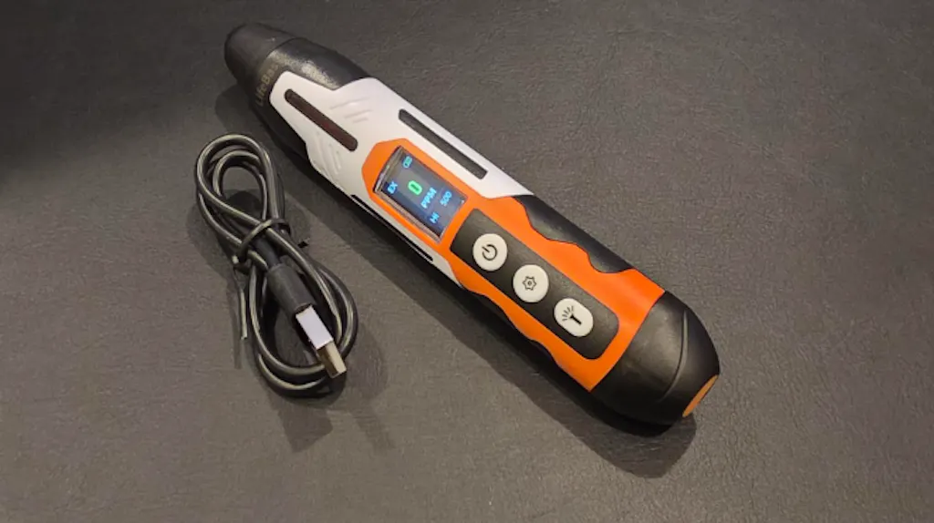 Equipped with a modern USB Type-C port for convenient charging. A full charge (1-2 hours) provides up to 1.5 hours of continuous operation. Features auto-shutoff after 5 minutes of inactivity and a low battery warning.