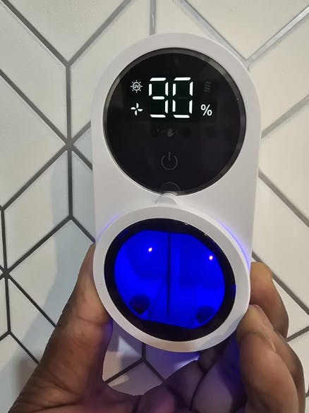Shows disinfection progress (%), battery level, and drying status at a glance.